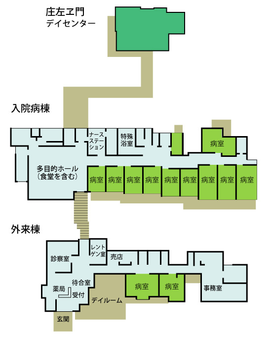 病室10部屋 / 家族室 / 応接室 / 普通浴室 / 特殊浴室 / 家族用キッチン / コインランドリー / 多目的ホール(食堂)